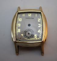 Few people know that Hamilton did not make their cases. In fact, Hamilton only produced movements. The cases were designed and manufactured by companies such a Star and Wadsworth among others. Hamilton often sold its movements uncased to jewelers. These represent cases used by a Jeweler in the early stages of the Great Depression. Though Hamilton used tough 10K gold as the filling, they specified thin cases that brass easily. The one on the left has a striking resemblance to a Morley with its stepped down sides.