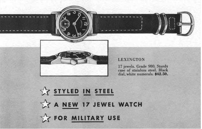 The Lexington came with a 17 Jewel Movement and retailed for $42.50. This was a civilian watch even though the Ad says ‘for military use’. This is a much finer quality and less rugid watch than those made for and issued by the military. It also uses a 980 movement rather than the 987A and F series the US military requisitioned.