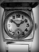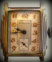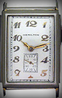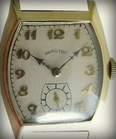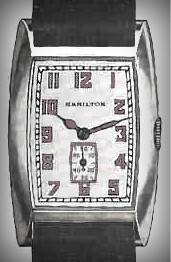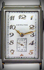Hamilton produced this model with a stepped case. Colletors consider it an art-deco design, but that’s debatable. The stepped case lends itself to brassing and wear.