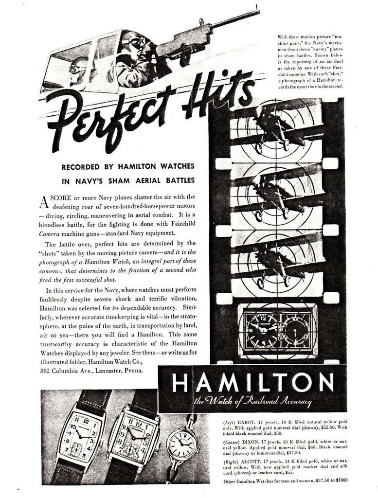 The WW II Hamilton Bomb Timer also known as the Fairchild Camera Gun timepiece used a 980 17 Jewel Hamilton movement. The Navy specified a Keystone Case and utilized a Fairchild CG – 16 Camera. Fairchild placed the Hamilton into the camera and used it for training.