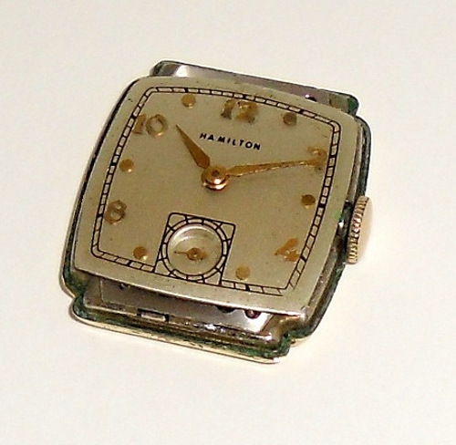 “It’s unusual to find a Hamilton wristwatch in excellent original condition. This model came with a Butler finish dial with 18K applied numerals and hands. The case is 14K Gold Filled (see photo of back and sides). The curved crystal is clear and has no scratches. The band is New Old Stock (NOS) size 15 Regular – a replacement to match the original color and appearance – made in Canada. The movement is a demasked 982, 19 Jewel running well 14/0 size. The mainspring runs in excess of 24 hours.